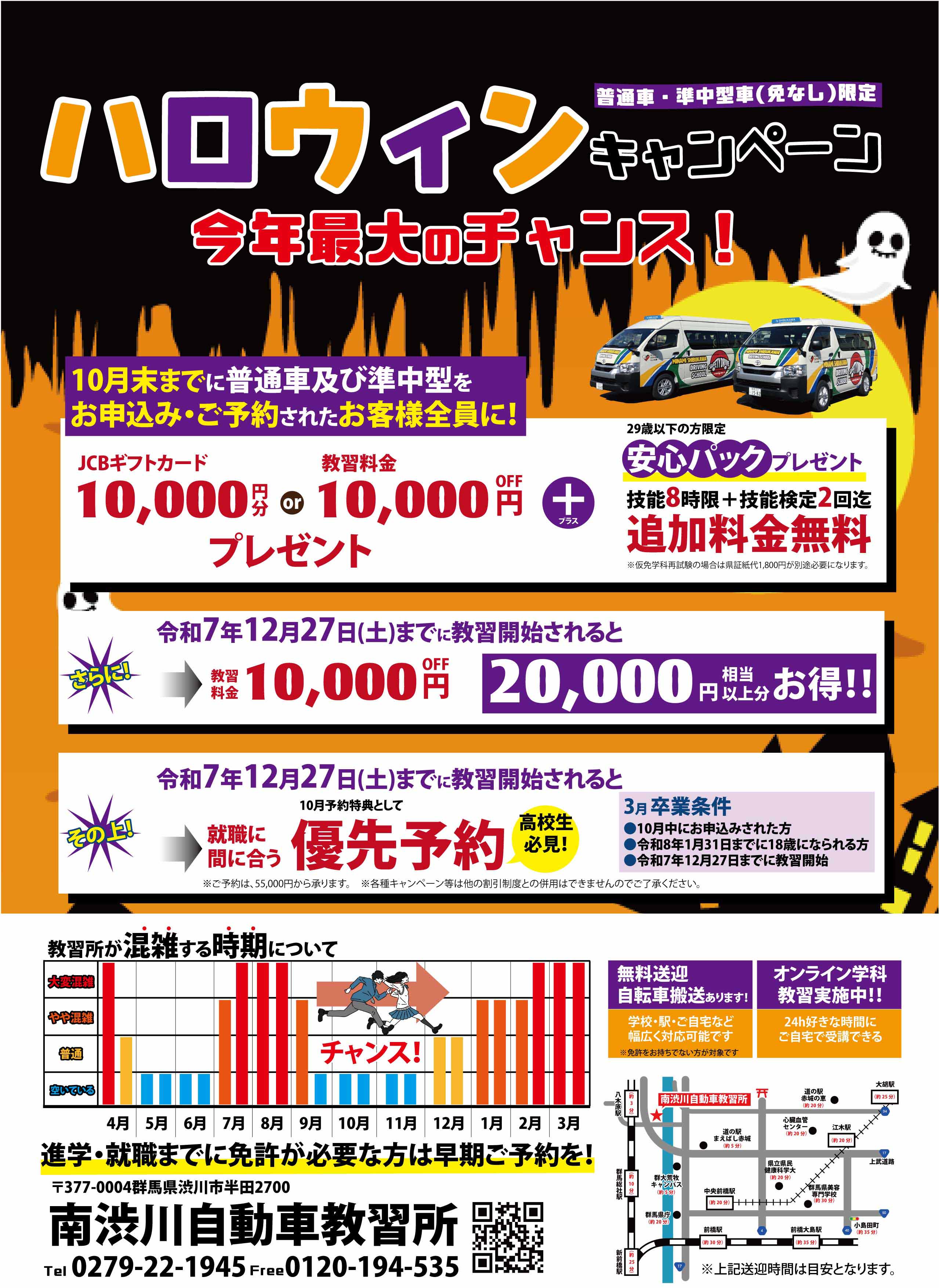 ①10月中のお申込みで教習料金1万円お値引きorJCBギフトカード1万円分プレゼント