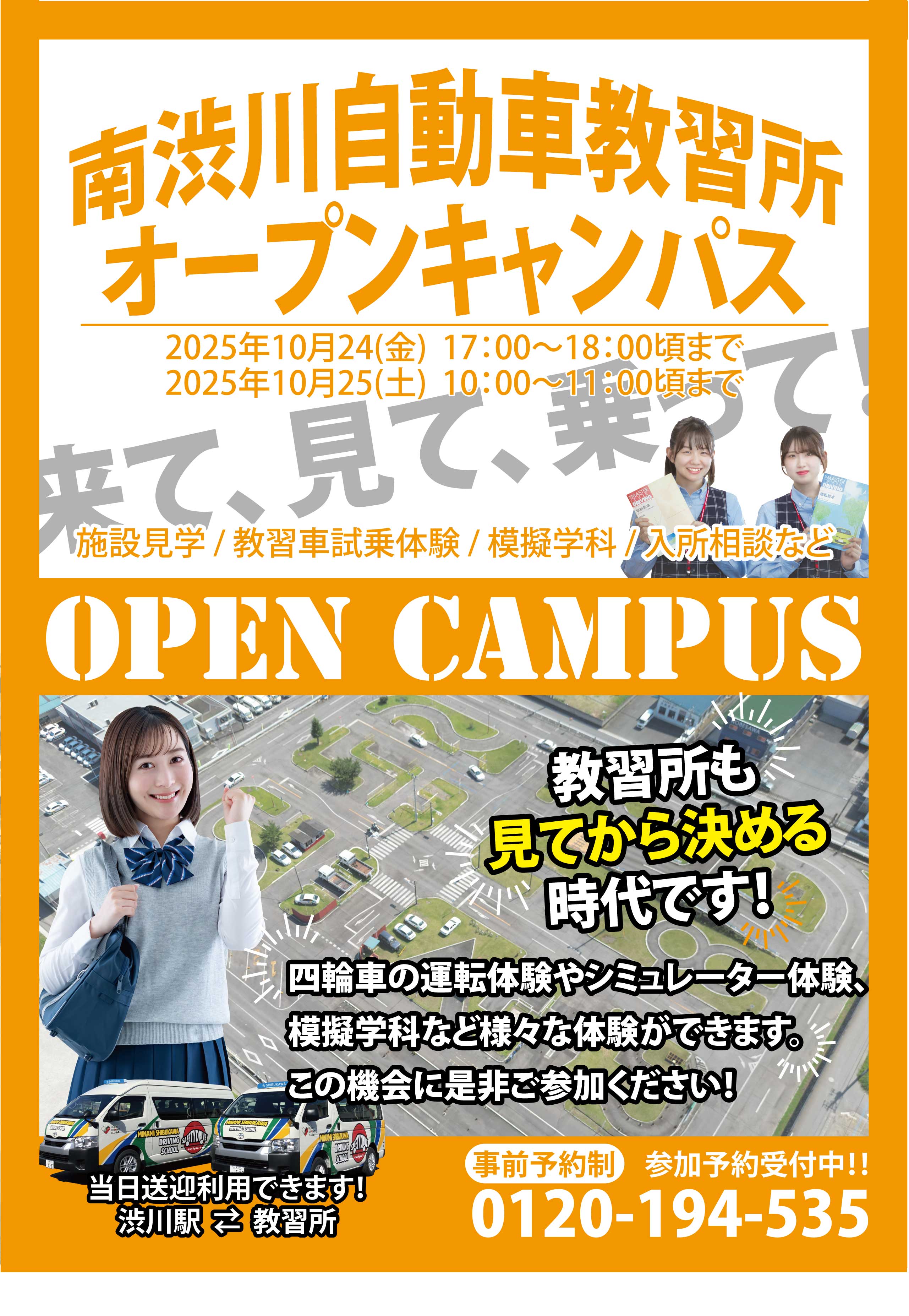 2025年10月20日 お知らせ オープンキャンパス開催! 令和7年10月24日17:00~18:00頃まで 10月25日10:00~11:00頃まで にオープンキャンパスを行います! 「これから教習所に通いたけど、初めてだし不安…」「どういう場所かあらかじめ知りたい」等 教習や施設の詳細を知りたい方は、ぜひご連絡ください!! 当日に渋川駅から送迎もご利用できますのでご相談ください♪